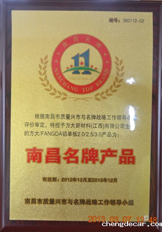 该项荣誉是经南昌市质量兴市与名牌战略工作领导小组审查通过,符合南昌名牌产品的各项标准和要求的产品,本次新材料公司获得“南昌名牌产品”称号是对chengdecar新材料生产的铝单板产品质量的肯定。