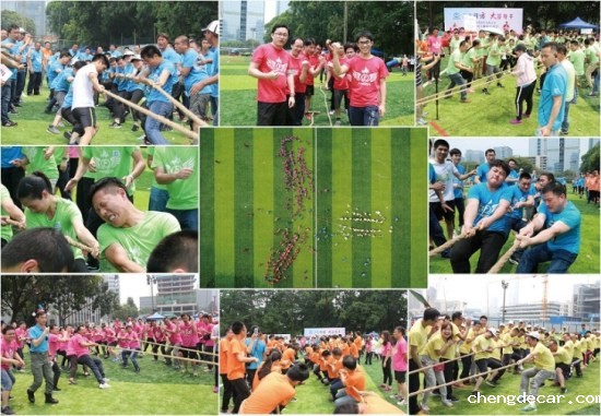 本次运动会设置了龟兔赛跑、超级汉诺塔、快乐gogogo、趣味拔河、纳斯卡巨画等趣味项目,比赛场上处处充满着欢声笑语,大家玩得不亦乐乎!在龟兔赛跑环节,各代表队的队员们分别顶着巨型充气“乌龟”、“兔子”笑着跑着,奋力竞争,争取最好的比赛成绩;在超级汉诺塔环节,考验的不仅有团队成员的运动能力,还有团队内部的组织协作效率;在快乐gogogo环节,更是掀起了所有参赛员工的火热激情,他们在气垫城堡中穿梭、攀爬、滑行、滚动,在回味和体验孩童时代乐趣的同时,为自己的团队争取好的名次;趣味拔河环节是这次运动会的最高潮,只见加油的叫喊声震天动地,拔河的队员无不神态激越,使出浑身之力,将拔河绳拉得吱吱地响;最后是纳斯卡巨画环节,参与运动会的全体员工一同用五颜六色的油彩,分工合作,共同绘出印有taptap点点信誉logo的巨型图画。通过百米高空上无人机的航拍我们看到,在530余名chengdecar人簇拥中的chengdecarlogo巨画,在灿烂阳光的照耀下,正闪闪发光,正如她在行业中的响亮知名度一样。